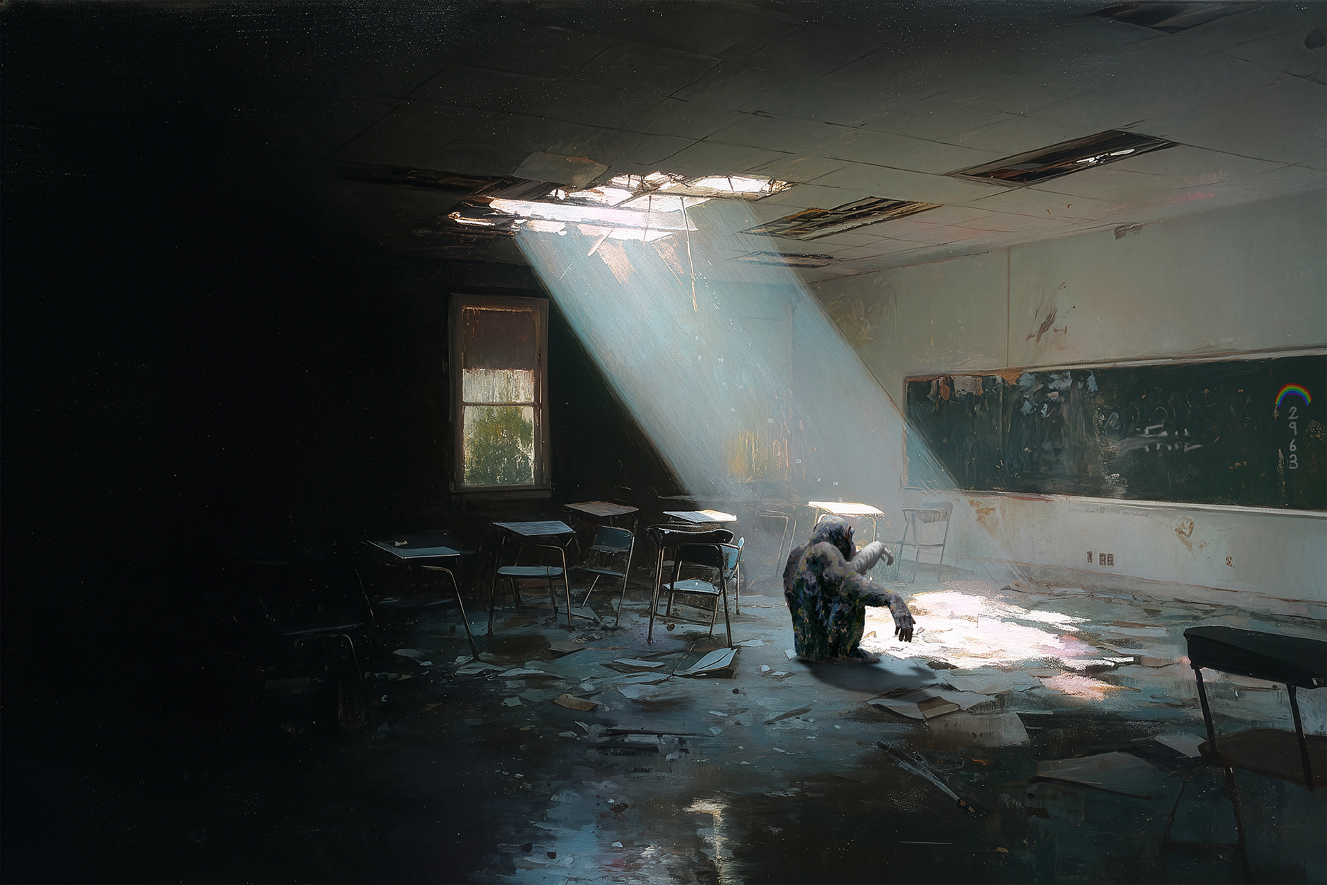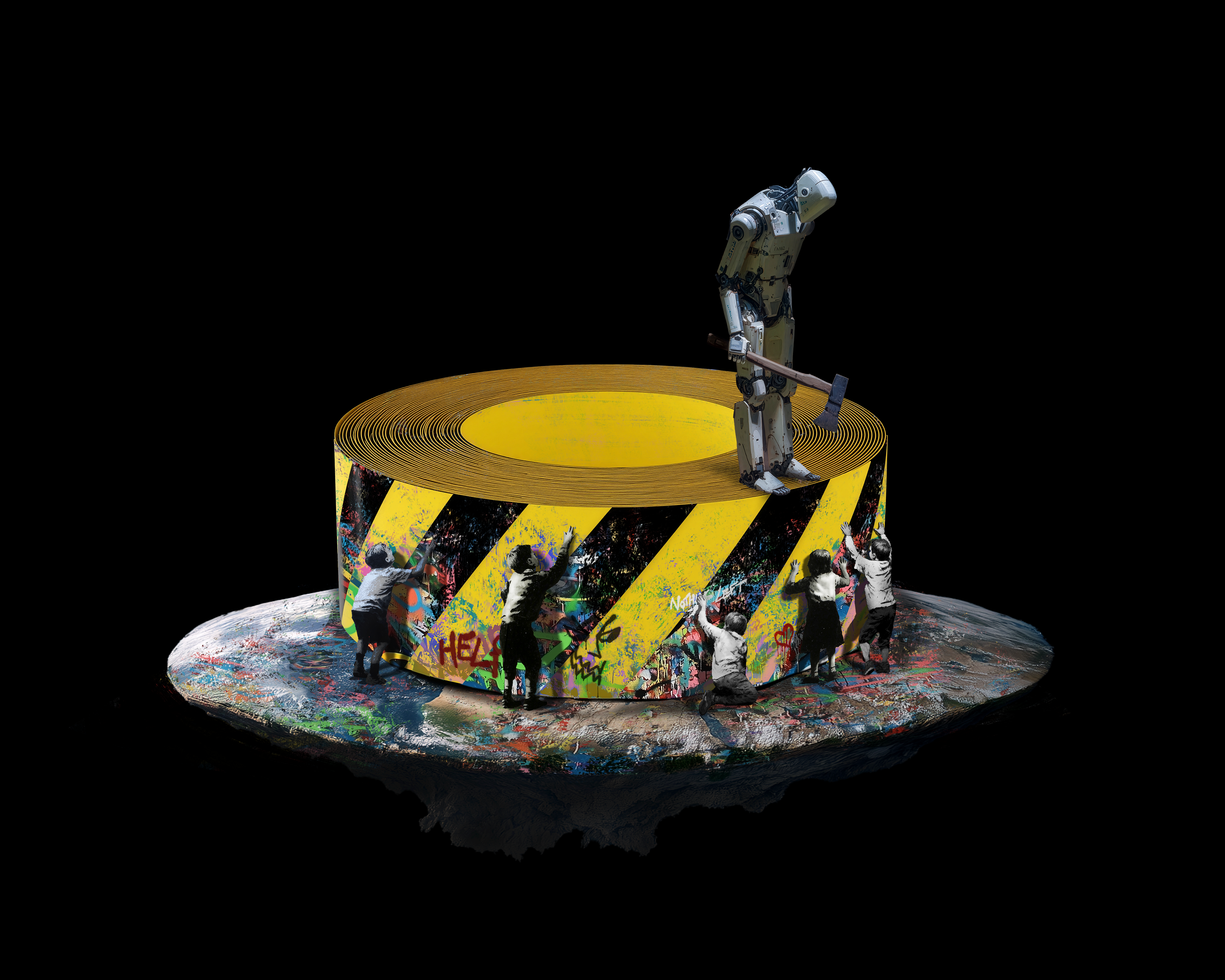 Transitioning from Robocops first awakening as a conversion of human to android representing humanities current affairs, neurolink, metadata, digital consciousness and extension of ourselves to begin. It will spiral and compound so fast with A.I before you know it, you'll be gone. Moving into silence and Simba from The Lion King shouting for help "somebody...anybody" because their wont be anybody around you. This is a reference to the animal kingdom, innocence in nature with a subdued reference to myself and England. Lions being the symbol of England and the lost youthful nature of Simba in his singular brave yet fragile and lonely existence. From there shots are fired, war begins with 'the construct' is all left after WW3. From there we see a huge varied amount of cleanup requests that somehow don't feel human even thought they appear as such. These "isles" will exist as like plains, realms or dimensions. They will appear all the same but have distinct differences in value stylistically in their code. You will feel that code no different than the hair on the back of your neck. You're last human ability to combat A.I is to become a digital janitor. One of real abstract nature to walk amongst each isle and clean/create and adapt how you choose.
