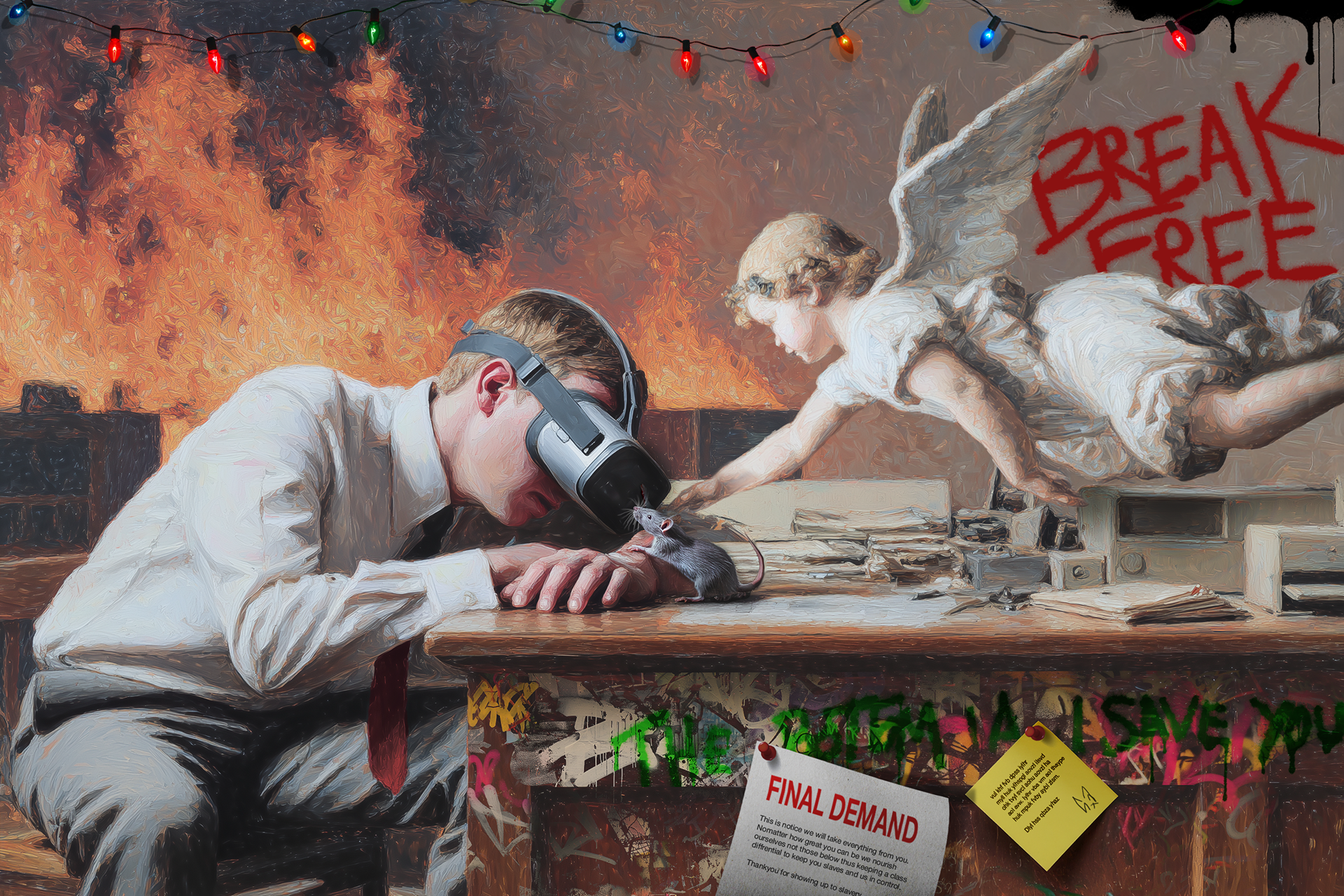 Hyperreality, our time of NFT, financial institutions and self protection. This is a rework of "La Bacchante" by William Bouguereau which depicted a ram attacking a woman. Times have changed, hyper-real surrealism to define our time.